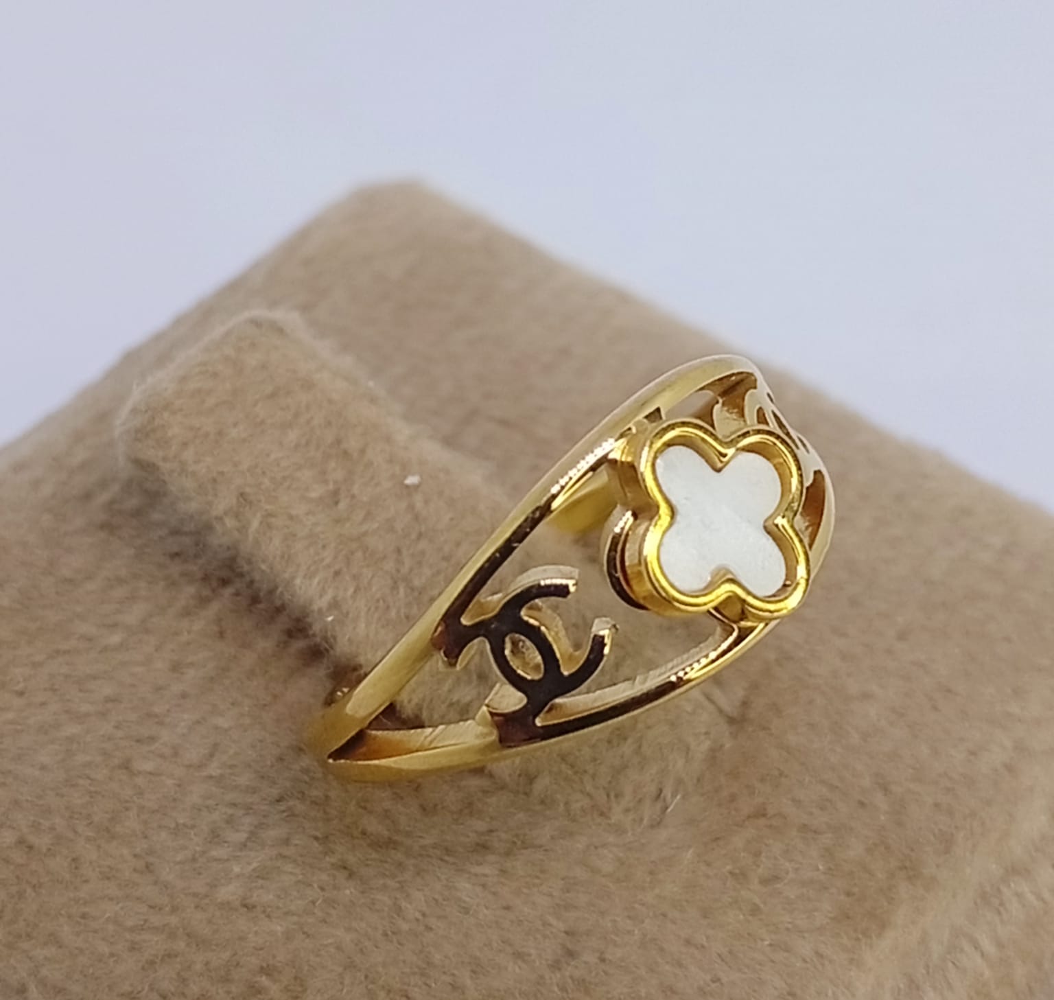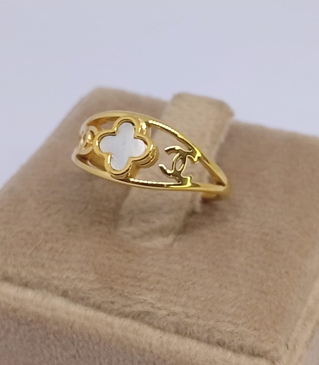 Anel Dourado Trevo Madrepérola